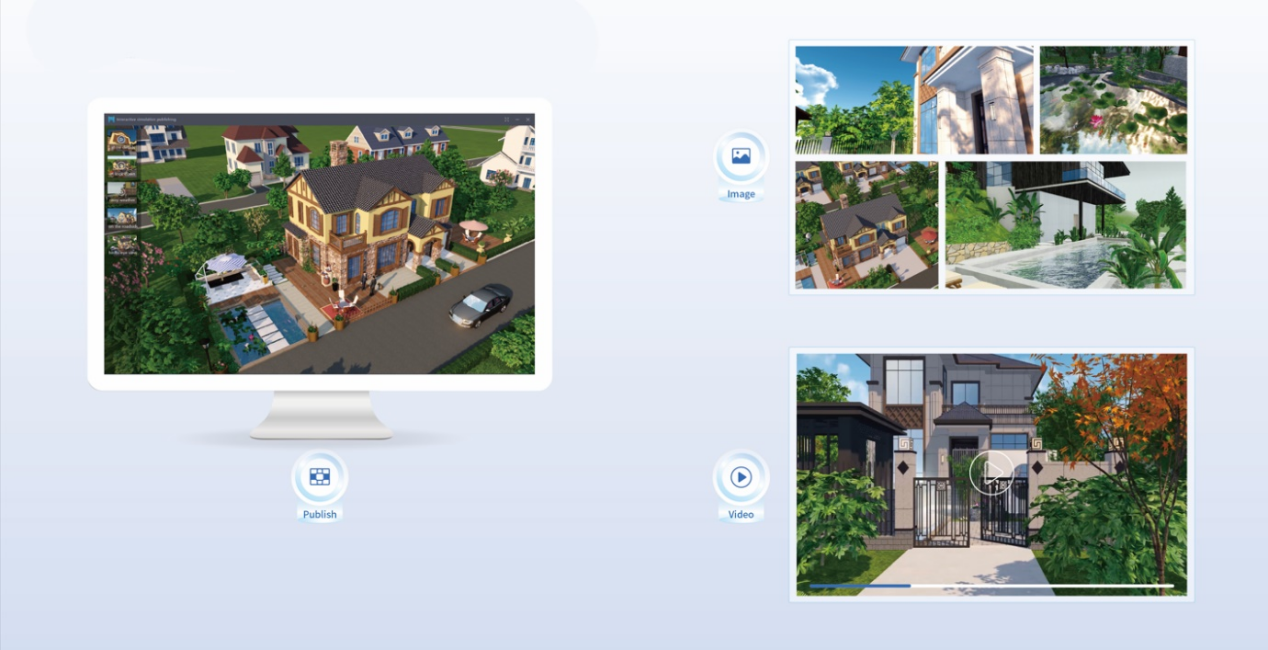 Houseplan allows you to export images and videos by specifying your preferred camera angles or paths. In addition, you can publish your simulation as stand-alone executable (EXE) files.